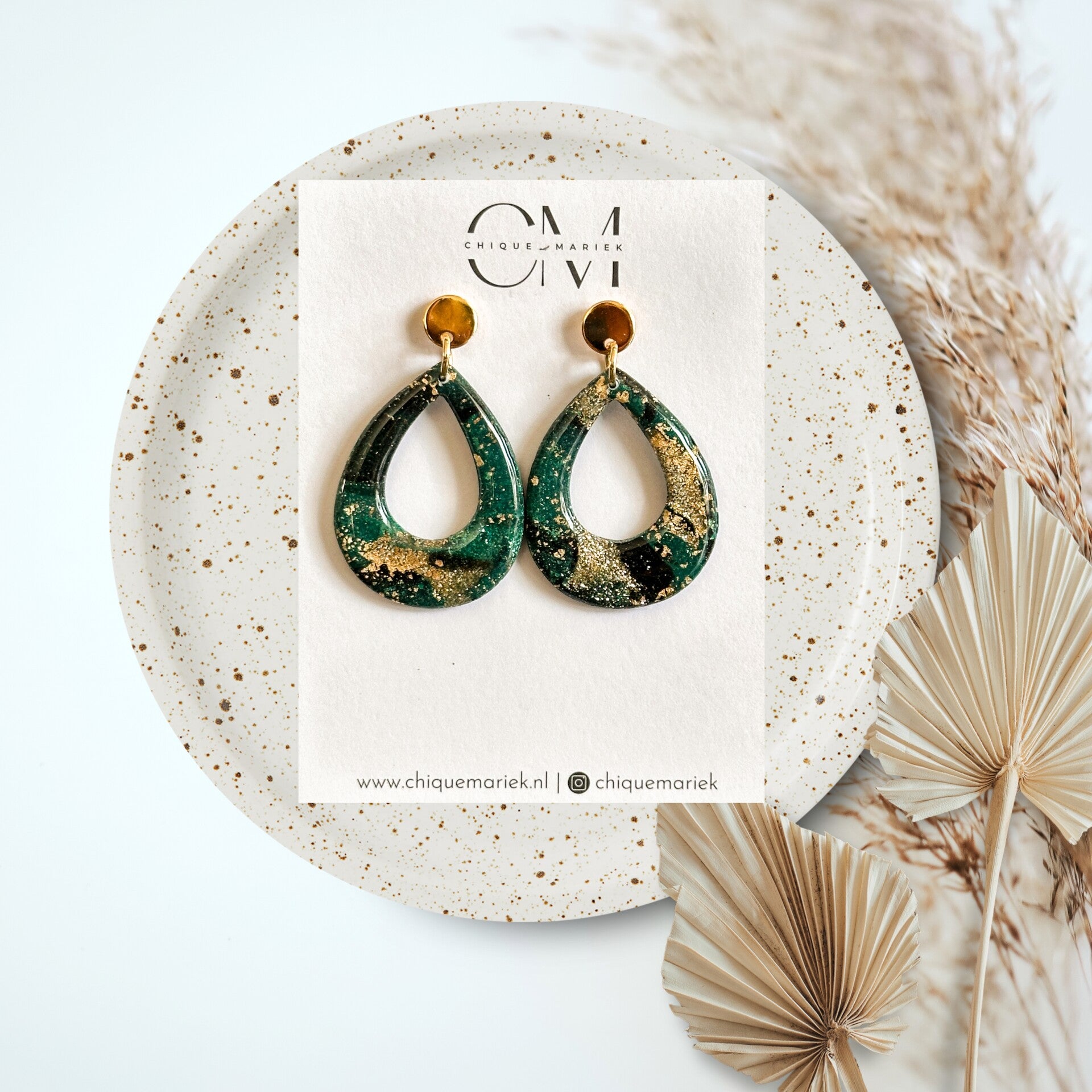 Prachtige oorbellen in groen, zwart en gouden tinten met een leuk glitter effect. Afwerkt met een mooie glanslaag.