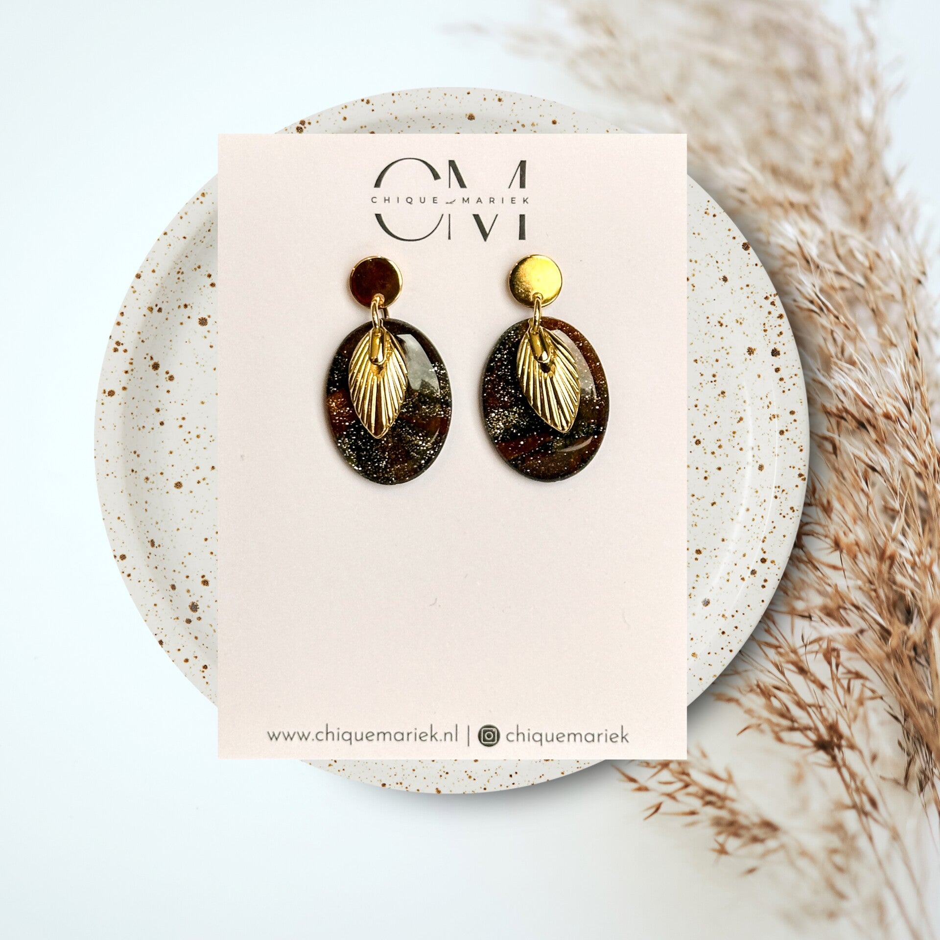 Prachtige oorbellen in brique zwarte en gouden tinten met een leuk glitter effect en toffe gouden blaadjes. Afwerkt met een mooie glanslaag.