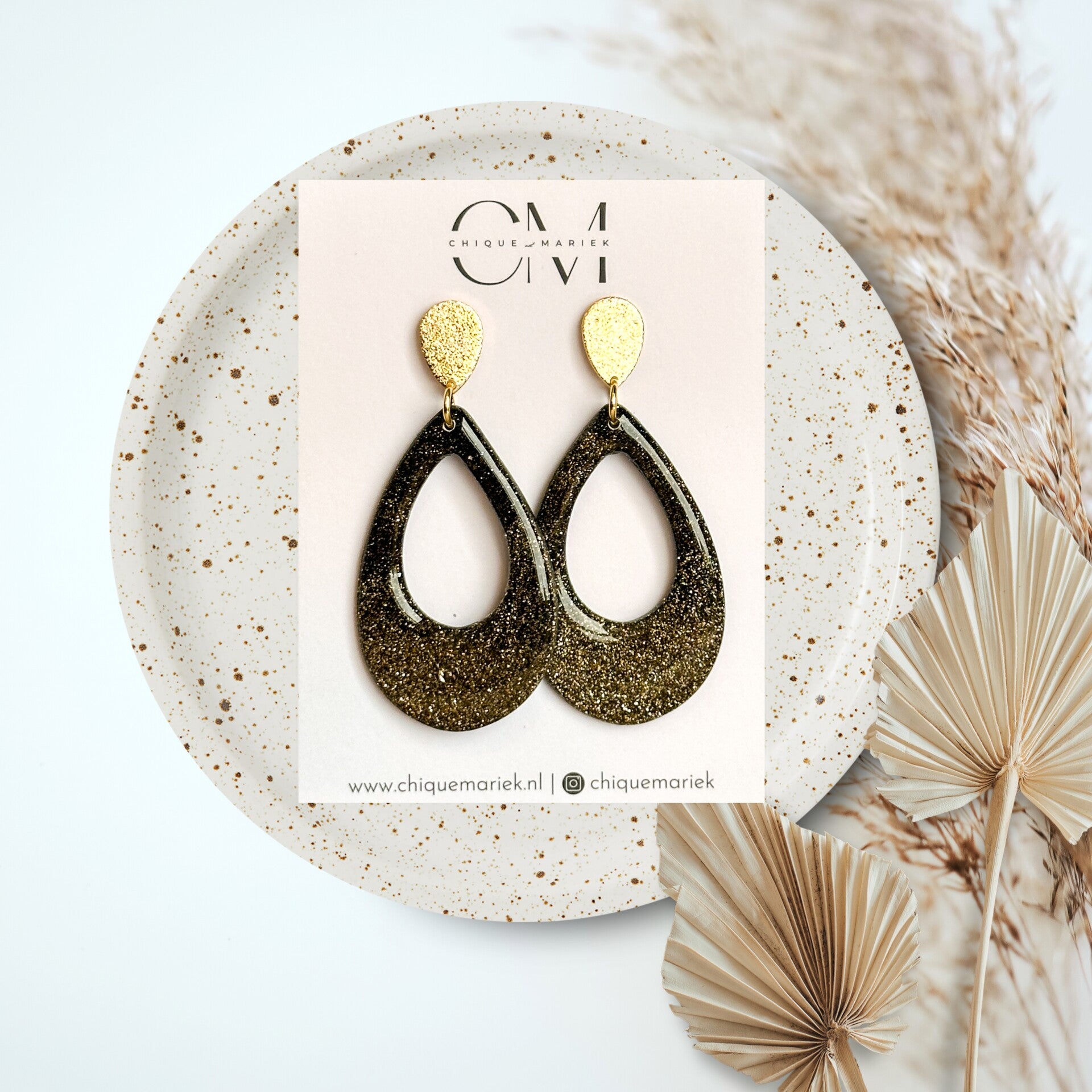 Prachtige oorbellen in zwarte tinten met een leuk goudglitter effect. Afwerkt met een mooie glanslaag.