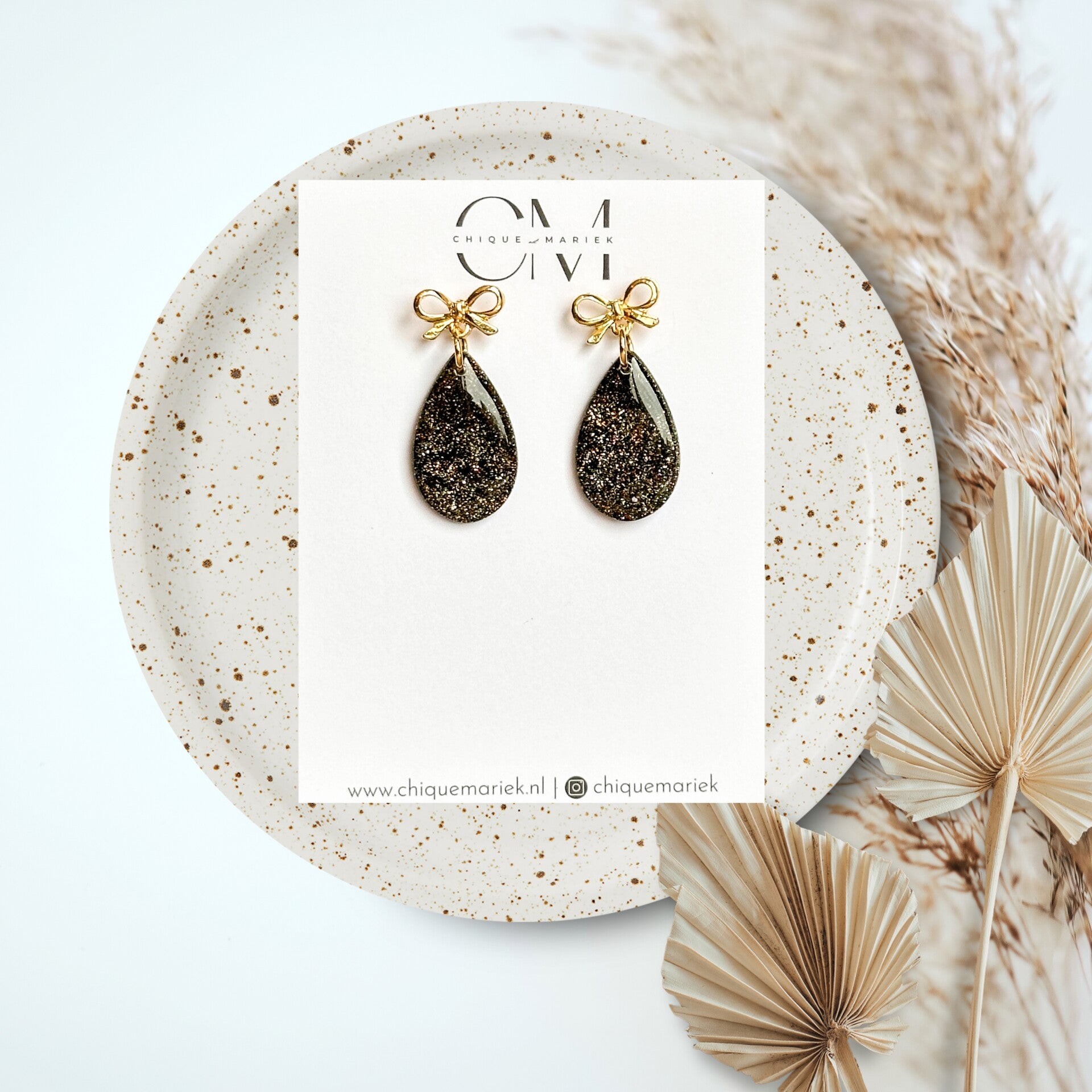 Prachtige oorbellen in zwarte tinten met een leuk goudglitter effect. Afwerkt met een mooie glanslaag.