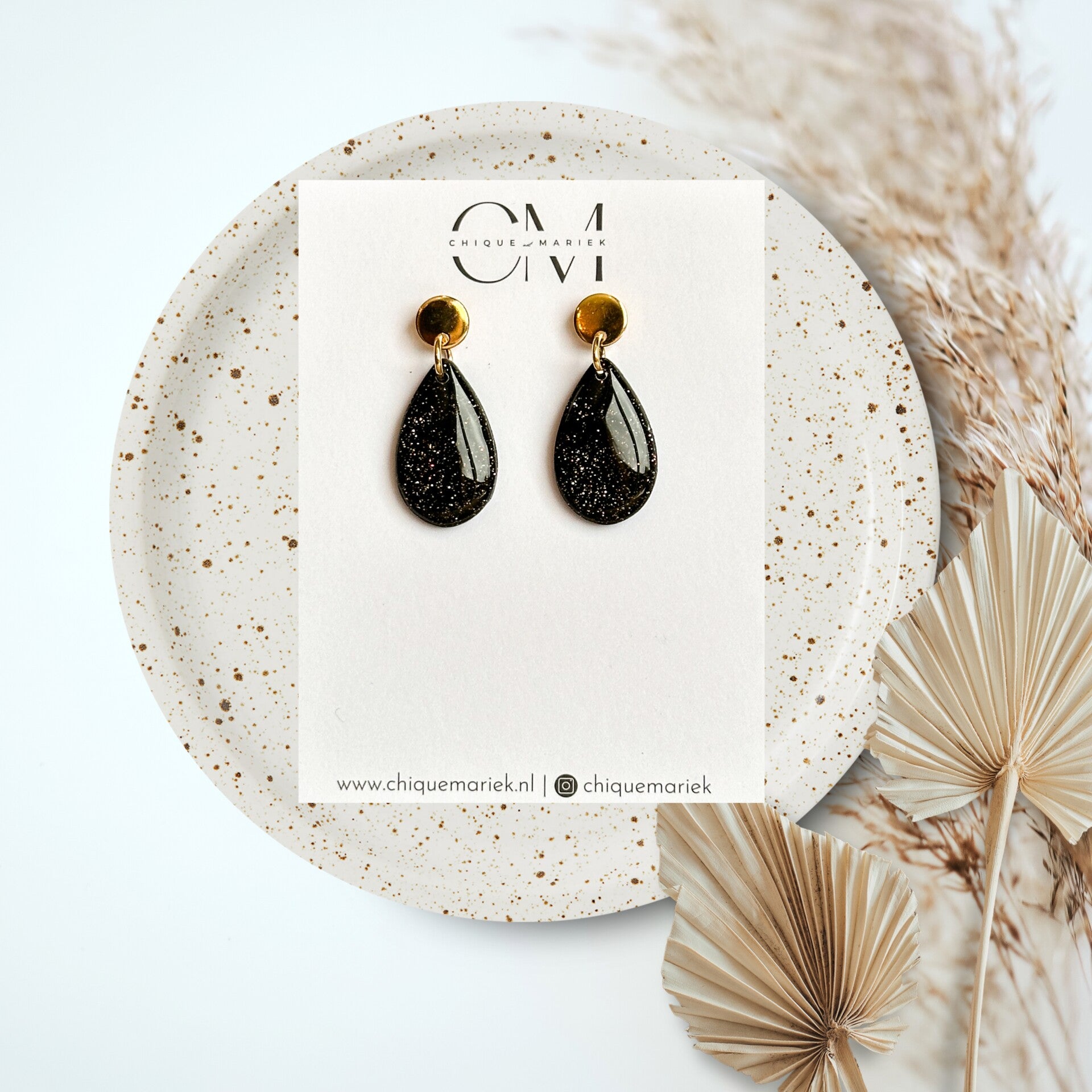 Prachtige oorbellen in zwarte tinten met een leuk goudglitter effect. Afwerkt met een mooie glanslaag.