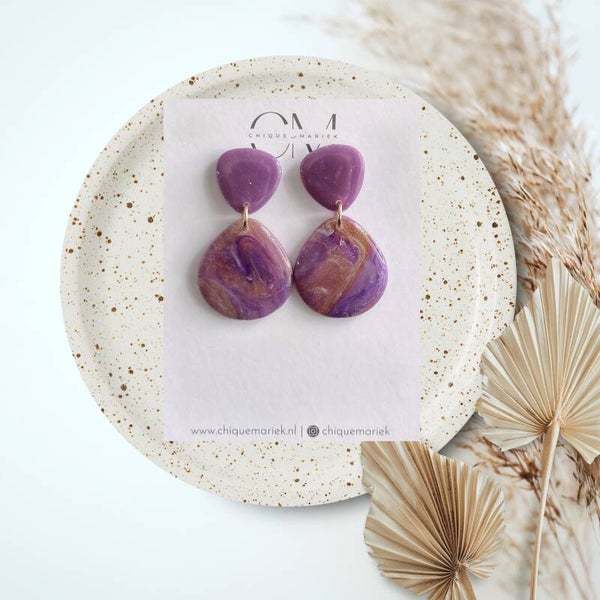 Prachtige oorbellen in paarse en gouden tinten afgewerkt met een mooie glanslaag.