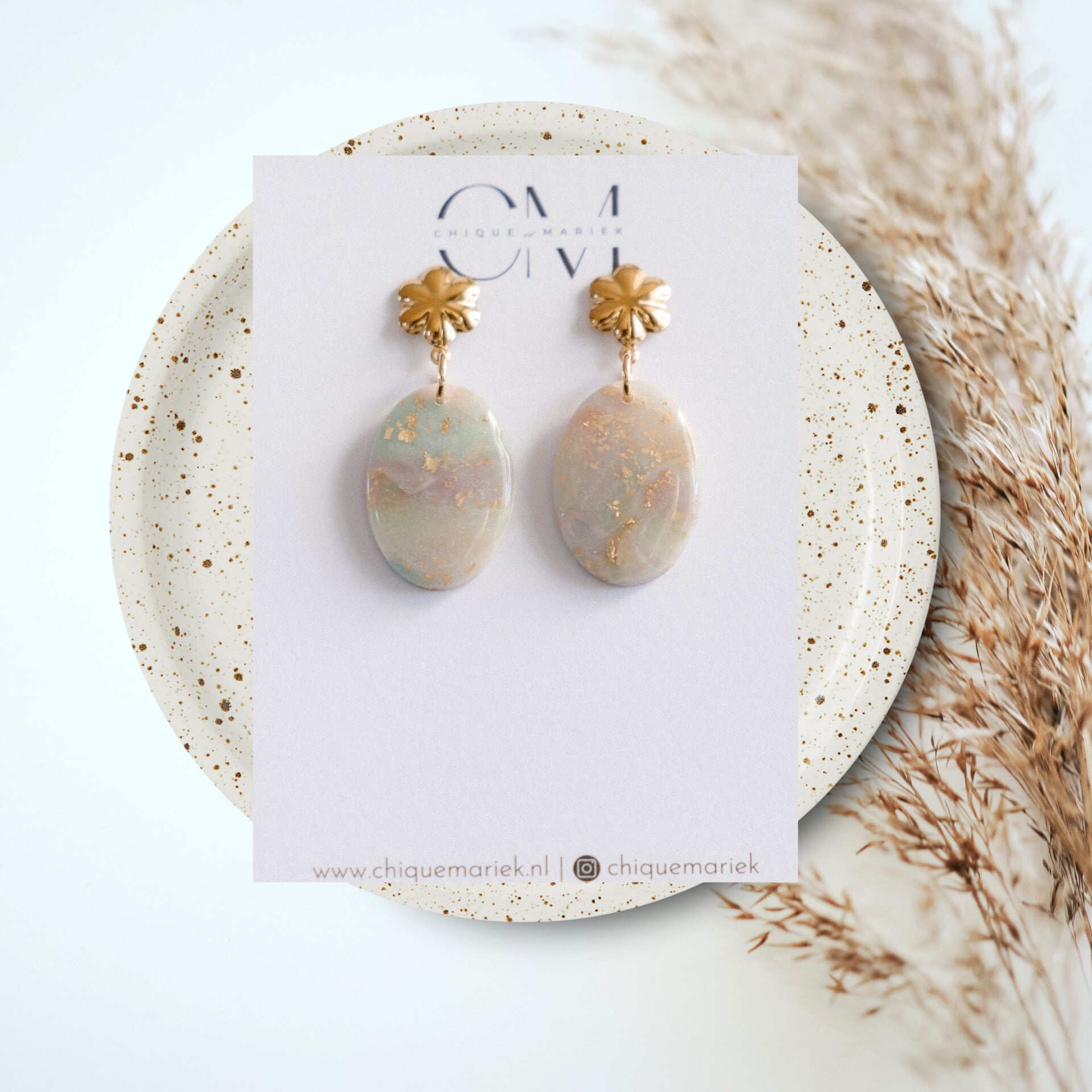 Prachtige oorbellen in mooie pastel tinten en een touch of gold. Een super leuk studje en afgewerkt met een mooie glanslaag.