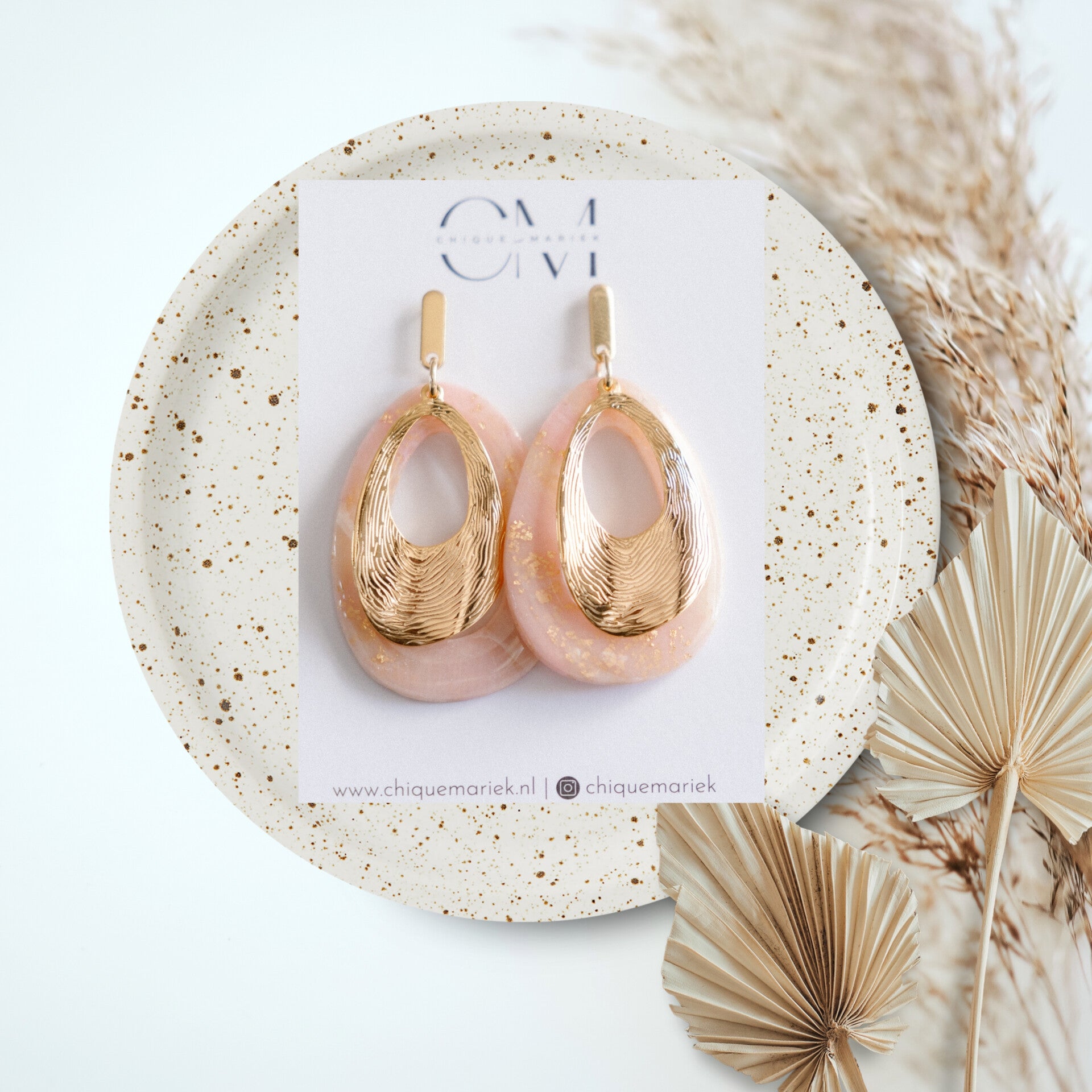 Prachtige oorbellen in mooie pastel roze tinten en een touch of gold. Afgewerkt met een mooie glanslaag. De oorbeel heeft hele toffe 18k. gold plated hangers.