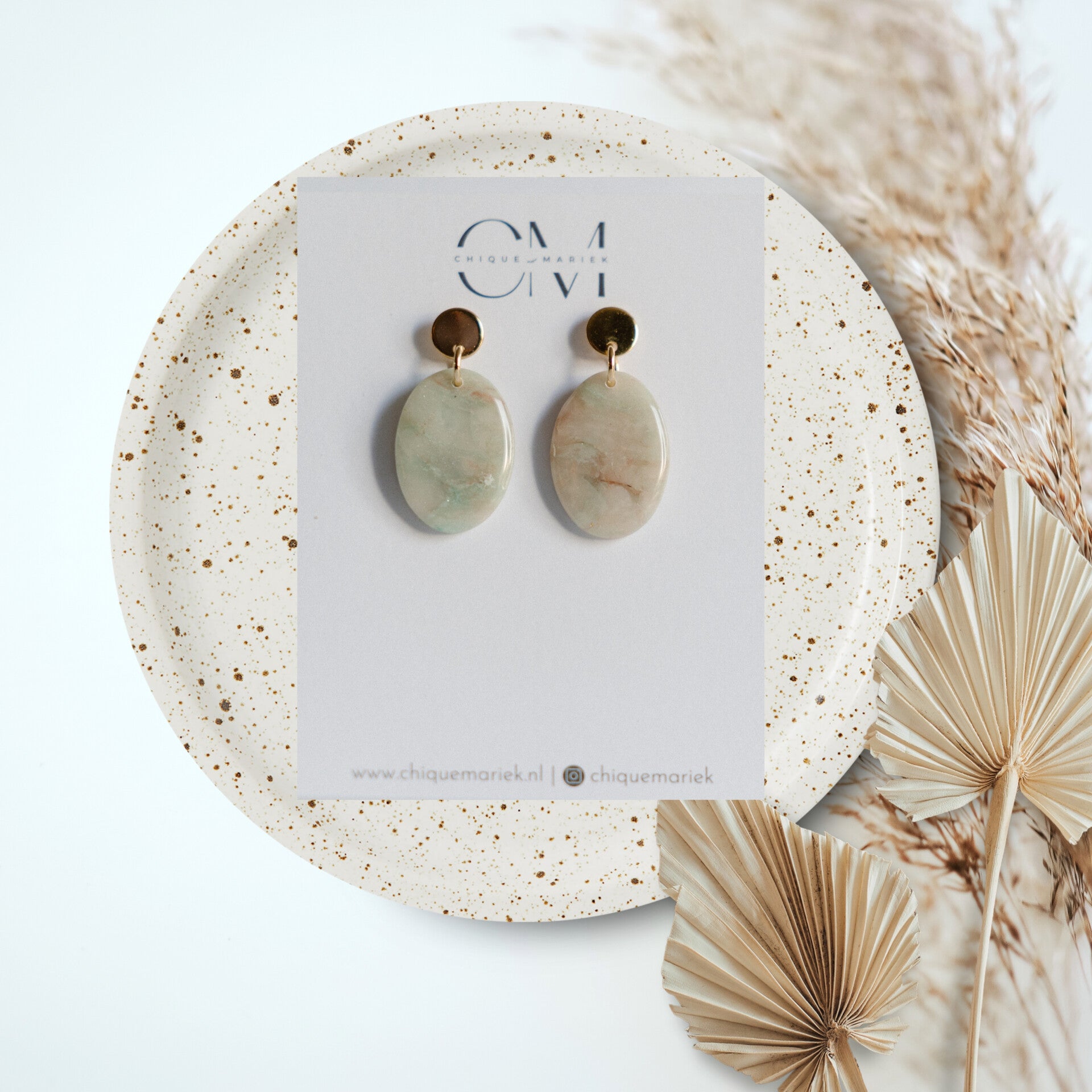 Prachtige oorbellen in mooie groene tinten. Afgewerkt met een mooie glanslaag.