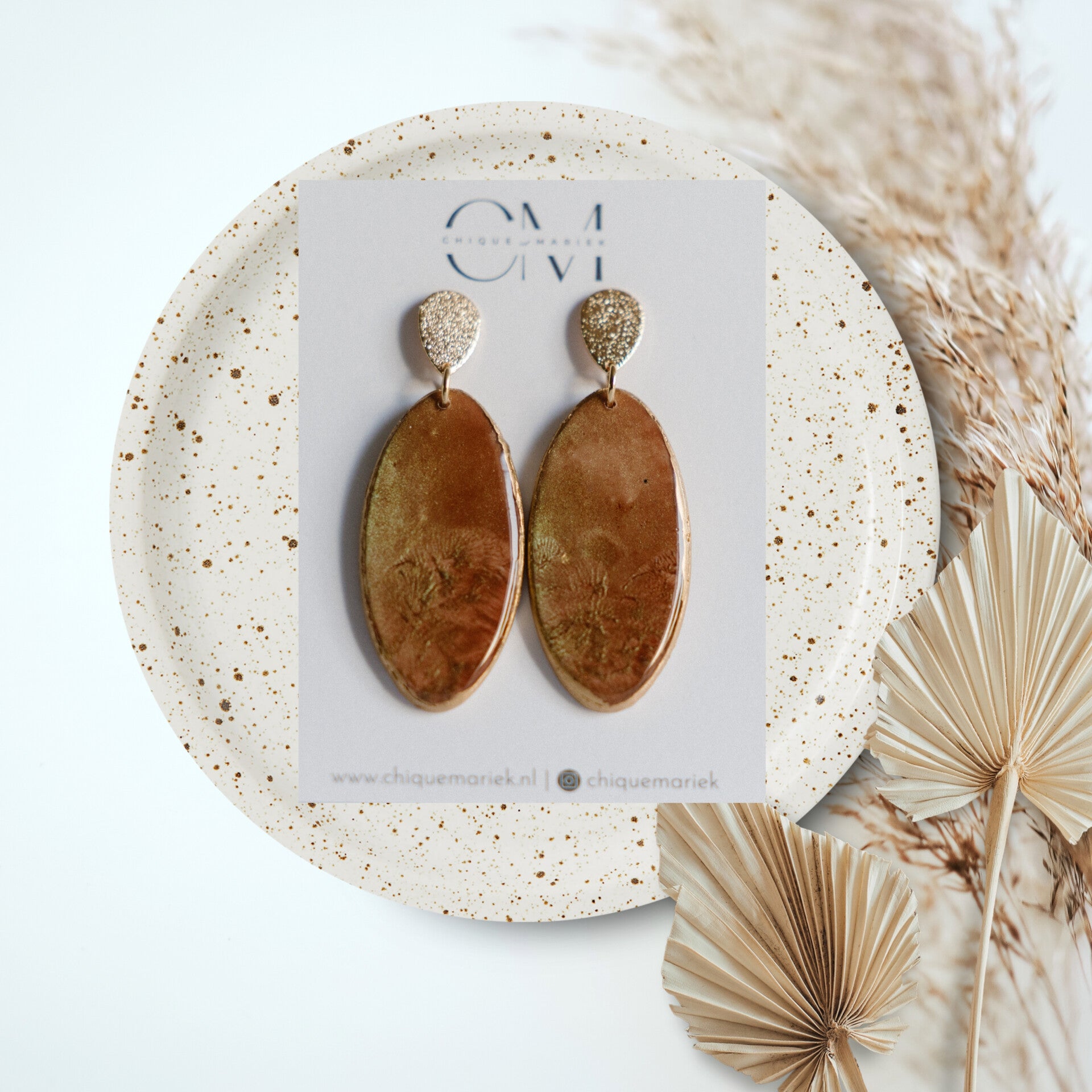 Prachtige oorbellen in mooie groen en gouden tinten. Afgewerkt met een mooie glanslaag en gouden randjes. Deze oorbel heeft een tof effect waarbij de kleur verschillend toont afhankelijk van het licht wat er op valt.