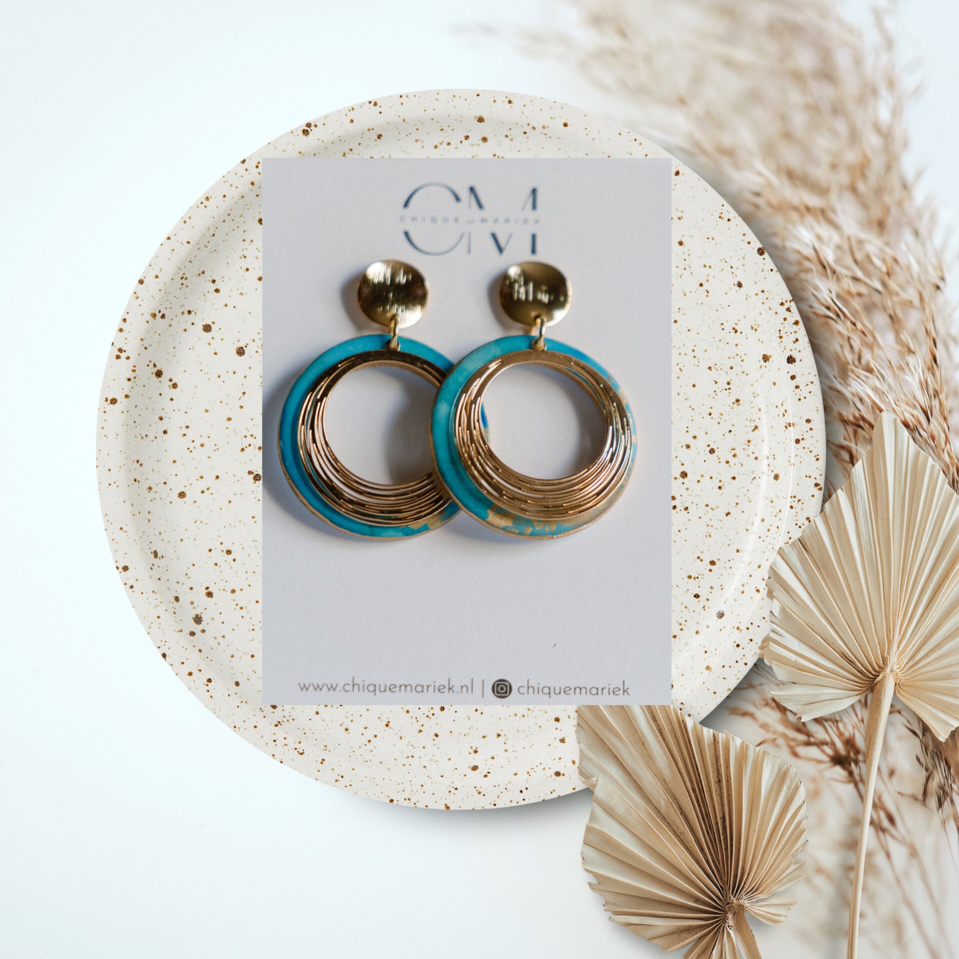 Prachtige oorbellen in mooie blauw en gouden tinten. Afgewerkt met een mooie glanslaag en gouden randjes en toffe hangers gold plated.
