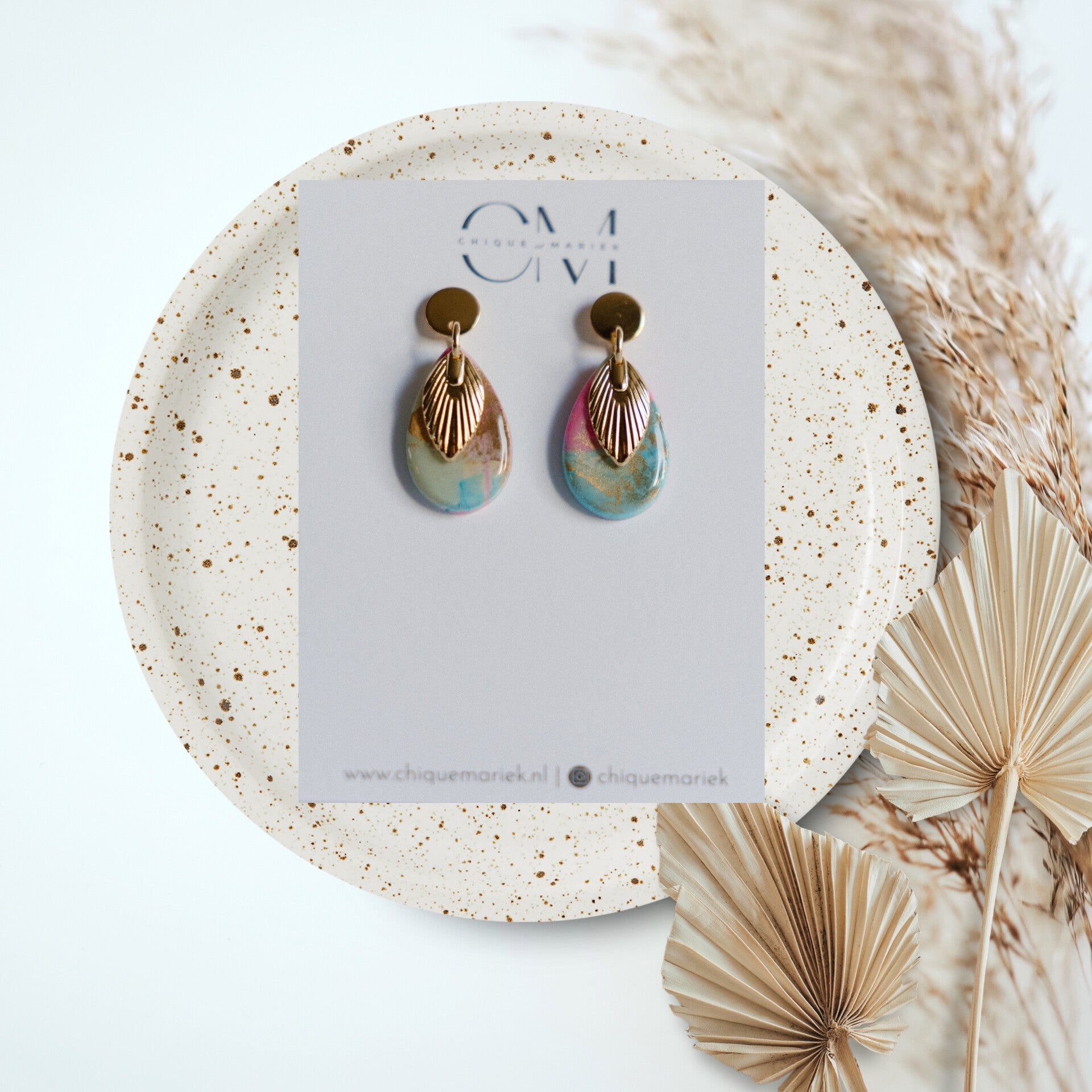 Prachtige oorbellen in mooie zomerse tinten. Afgewerkt met een mooie glanslaag en een leuke hanger.