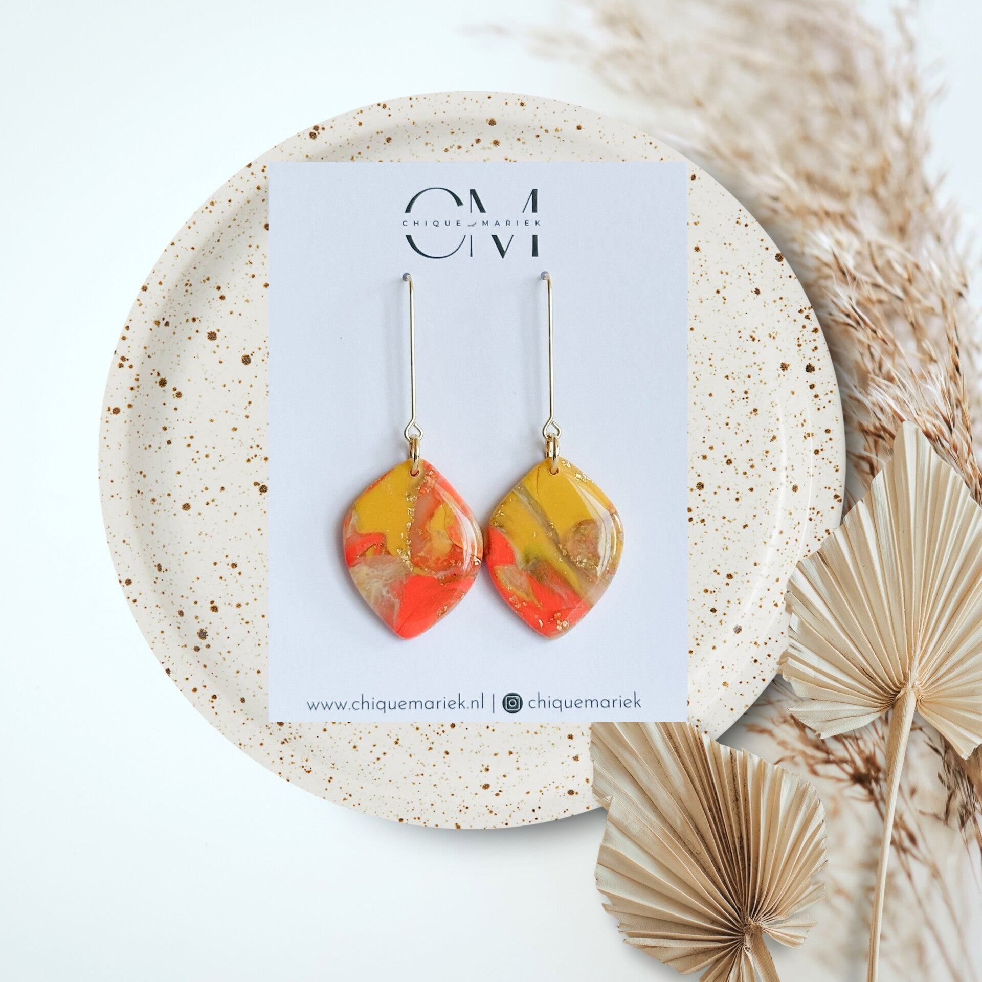 Prachtige oorbellen in leuke zomerse tinten. Afgewerkt met een mooie glanslaag.