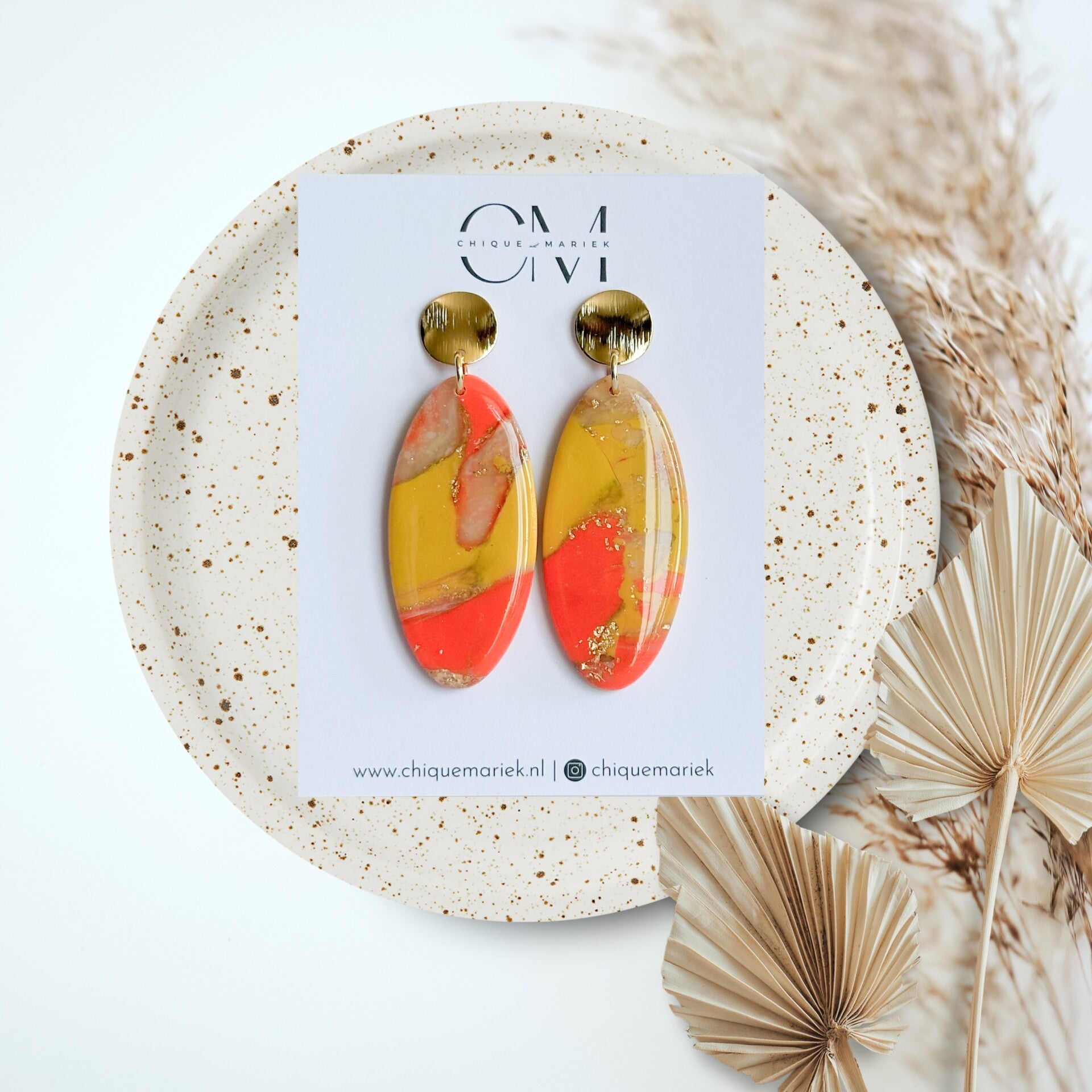 Prachtige oorbellen in leuke zomerse tinten. Afgewerkt met een mooie glanslaag.