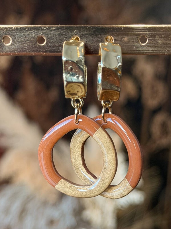 Prachtige oorbellen in fijne herfst tinten. Afgewerkt met een mooie glanslaag. De oorbellen hangen aan een ring met steker.