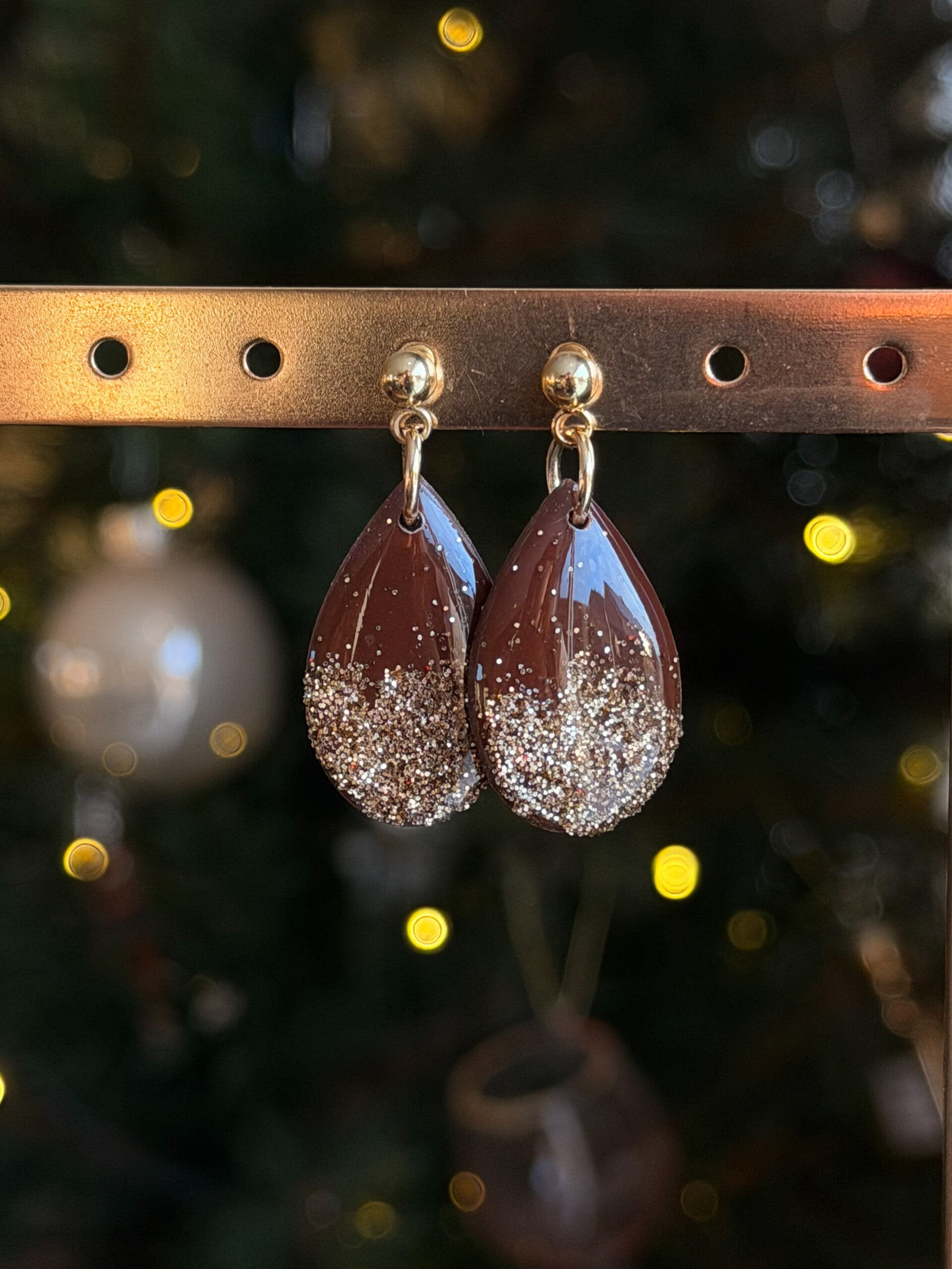 Prachtige oorbellen in bruine tinten met glitters. Afgewerkt met een mooie glanslaag.